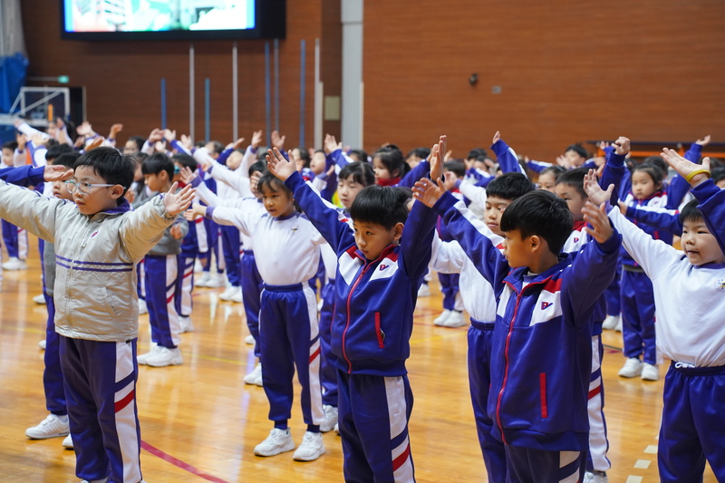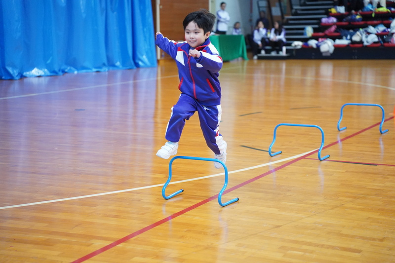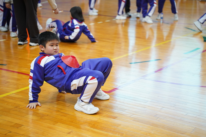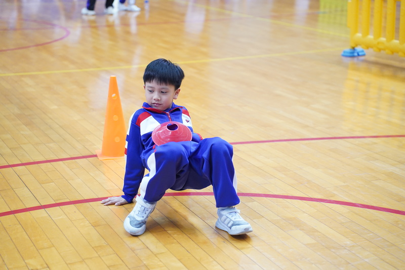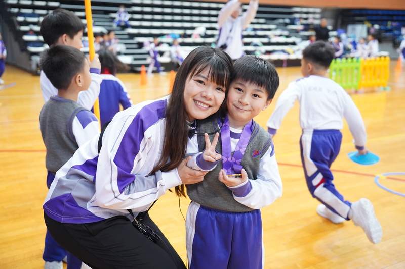 競技日活動設計兼具體育性與趣味性,共設置十大運動挑戰項目,包括:考驗速度的直線跑、鍛鍊協調的十字跳、講究準度的籃球投籃與足球射門、互動十足的袋鼠跳與蜘蛛競速、注重平衡的摸橋過河、強化專注力的豆袋擲準、提升敏捷的繞杆來回跑,以及激發策略合作的三國爭霸。各項目巧妙融合跑、跳、投、爬、平衡等基礎動作,讓孩子們在遊戲中鍛鍊體能,提升身體協調與團隊配合能力。活動更特別安排「師生障礙跑比賽」,老師與學生並肩參與,在歡笑與鼓勵中跨越障礙,不僅增進了師生情感,也凝聚了班級的向心力與歸屬感。