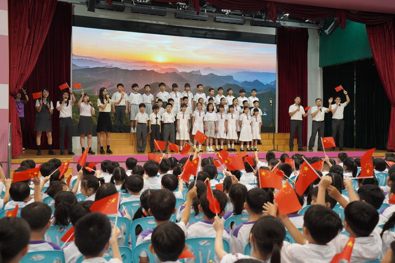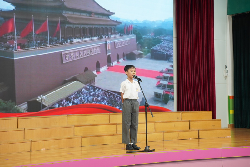 小學部慶祝活動在楊美蓮老師“大國華誕,繁盛共享”的主題演講中展開。隨後舉行新一屆學生會就職典禮,新任學生會主席發表致辭。學生代表唐俊熙及倫康喬同學分享了觀看九三閱兵的感想,表達了對軍人的崇高敬意與對祖國繁榮昌盛的自豪之情。最後,師生共同合唱《我愛你中國》,以歌聲獻上對祖國誠摯的祝福。