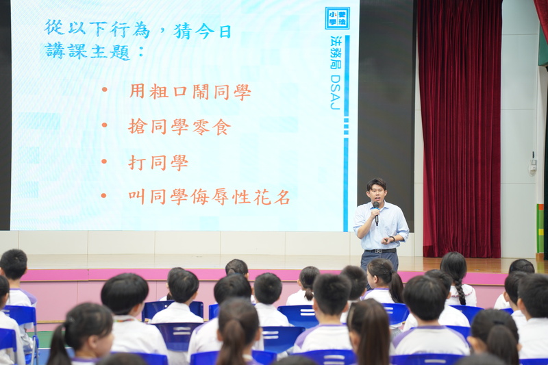 為幫助學生深入認識校園欺淩的危害並掌握應對方法,我校日前為小學部五年級學生開展預防校園欺淩主題周會,並邀請法務局專業人員蒞臨進行分享。